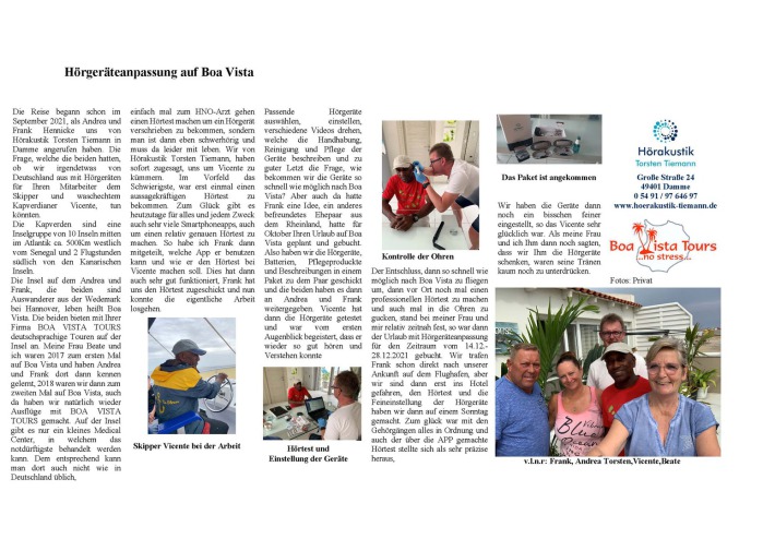 Die Insel auf dem Andrea und Frank, die beiden sind Auswanderer aus der Wedemark bei Hannover, leben heißt Boa Vista. Die beiden bieten mit Ihrer Firma BOA VISTA TOURS deutschsprachige Touren auf der Insel an. Meine Frau Beate und ich waren 2017 zum ersten Mal auf Boa Vista und haben Andrea und Frank dort dann kennen gelernt, 2018 waren wir dann zum zweiten Mal auf Boa Vista, auch da haben wir natürlich wieder Ausflüge mit BOA VISTA TOURS gemacht. Auf der Insel gibt es nur ein kleines Medical Center, in welchem das notdürftigste behandelt werden kann. Dem entsprechend kann man dort auch nicht wie in Deutschland üblich, einfach mal zum HNO-Arzt gehen einen Hörtest machen um ein Hörgerät verschrieben zu bekommen, sondern man ist dann eben schwerhörig und muss da leider mit leben. Wir von Hörakustik Torsten Tiemann, haben sofort zugesagt, uns um Vicente zu kümmern. Im Vorfeld das Schwierigste, war erst einmal einen aussagekräftigen Hörtest zu bekommen. Zum Glück gibt es heutzutage für alles und jedem Zweck auch sehr viele Smartphoneapps, auch um einen relativ genauen Hörtest zu machen. So habe ich Frank dann mitgeteilt, welche App er benutzen kann und wie er den Hörtest bei Vicente machen soll. Dies hat dann auch sehr gut funktioniert, Frank hat uns den Hörtest zugeschickt und nun konnte die eigentliche Arbeit losgehen.Passende Hörgeräte auswählen, einstellen, verschiedene Videos drehen, welche die Handhabung, Reinigung und Pflege der Geräte beschreiben und zu guter Letzt die Frage, wie bekommen wir die Geräte so schnell wie möglich nach Boa Vista? Aber auch da hatte Frank eine Idee, ein anderes befreundetes Ehepaar aus dem Rheinland, hatte für Oktober Ihren Urlaub auf Boa Vista geplant und gebucht. Also haben wir die Hörgeräte, Batterien, Pflegeproduckte und Beschreibungen in einem Paket zu dem Paar geschickt und die beiden haben es dann an Andrea und Frank weitergegeben. Vicente hat dann die Hörgeräte getestet und war vom ersten Augenblick begeistert, dass er wieder so gut hören und Verstehen konnte Der Entschluss, dann so schnell wie möglich nach Boa Vista zu fliegen um, dann vor Ort noch mal einen professionellen Hörtest zu machen und auch mal in die Ohren zu gucken, stand bei meiner Frau und mir relativ zeitnah fest, so war dann der Urlaub mit Hörgeräteanpassung für den Zeitraum vom 14.12.-28.12.2021 gebucht. Wir trafen Frank schon direkt nach unserer Ankunft auf dem Flughafen, aber wir sind dann erst ins Hotel gefahren, den Hörtest und die Feineinstellung der Hörgeräte haben wir dann auf einem Sonntag gemacht. Zum glück war mit den Gehörgängen alles in Ordnung und auch der über die APP gemachte Hörtest stellte sich als sehr präzise heraus, Wir haben die Geräte dann noch ein bisschen feiner eingestellt, so das Vicente sehr glücklich war. Als meine Frau und ich Ihm dann noch sagten, dass wir Ihm die Hörgeräte schenken, waren seine Tränen kaum noch zu unterdrücken